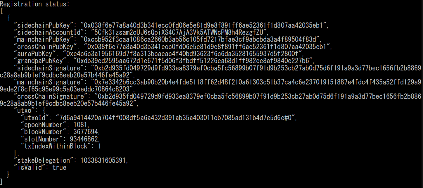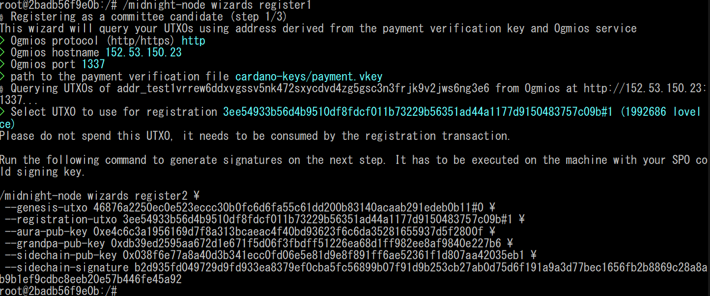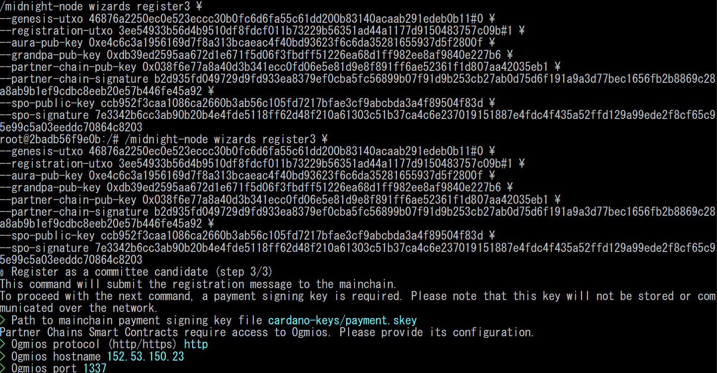 Partner Chains Smart Contracts require access to Ogmios. Please provide its configuration. Ogmios protocol (http/https) http Ogmios hostname 152.53.150.23 Ogmios port 1337 2025-10-30T08:49:59.870623523+00:00 INFO partner_chains_cardano_offchain::register - ✅ Transaction submitted. ID: 9df3fd3d0d9a9cd8fe6bca66f53d46758d9aff1191cd14f1e4b0dd6b9433569d 2025-10-30T08:49:59.870644235+00:00 INFO partner_chains_cardano_offchain::await_tx - Probing for transaction output '9df3fd3d0d9a9cd8fe6bca66f53d46758d9aff1191cd14f1e4b0dd6b9433569d#0' 2025-10-30T08:50:04.876191105+00:00 INFO partner_chains_cardano_offchain::await_tx - Probing for transaction output '9df3fd3d0d9a9cd8fe6bca66f53d46758d9aff1191cd14f1e4b0dd6b9433569d#0' 2025-10-30T08:51:09.971902401+00:00 INFO partner_chains_cardano_offchain::await_tx - Probing for transaction output '9df3fd3d0d9a9cd8fe6bca66f53d46758d9aff1191cd14f1e4b0dd6b9433569d#0' 2025-10-30T08:51:14.977857650+00:00 INFO partner_chains_cardano_offchain::await_tx - Probing for transaction output '9df3fd3d0d9a9cd8fe6bca66f53d46758d9aff1191cd14f1e4b0dd6b9433569d#0' 2025-10-30T08:51:19.984366002+00:00 INFO partner_chains_cardano_offchain::await_tx - Probing for transaction output '9df3fd3d0d9a9cd8fe6bca66f53d46758d9aff1191cd14f1e4b0dd6b9433569d#0' 2025-10-30T08:51:19.989579424+00:00 INFO partner_chains_cardano_offchain::await_tx - Transaction output '9df3fd3d0d9a9cd8fe6bca66f53d46758d9aff1191cd14f1e4b0dd6b9433569d' ? Show registration status? (Y/n)