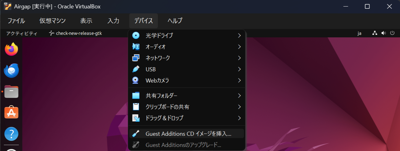 8-1. メニューの「デバイス」から「Guest Additions CD イメージを挿入...」を押下します。