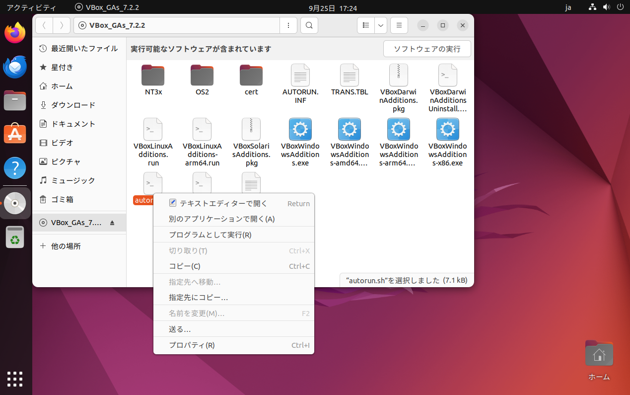 8-2. 左のランチャーバーのCDのマークを押下し、「ファイル」アプリを起動し「autorun.sh」を右クリックし、「プログラムとして実行」を押下します。