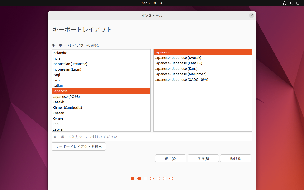 6-4. 以下の画面では、「Japanese」「Japanese」を選択してください。USキーボードをご利用の方は、「キーボードレイアウトを検出」ボタンを押下してください。