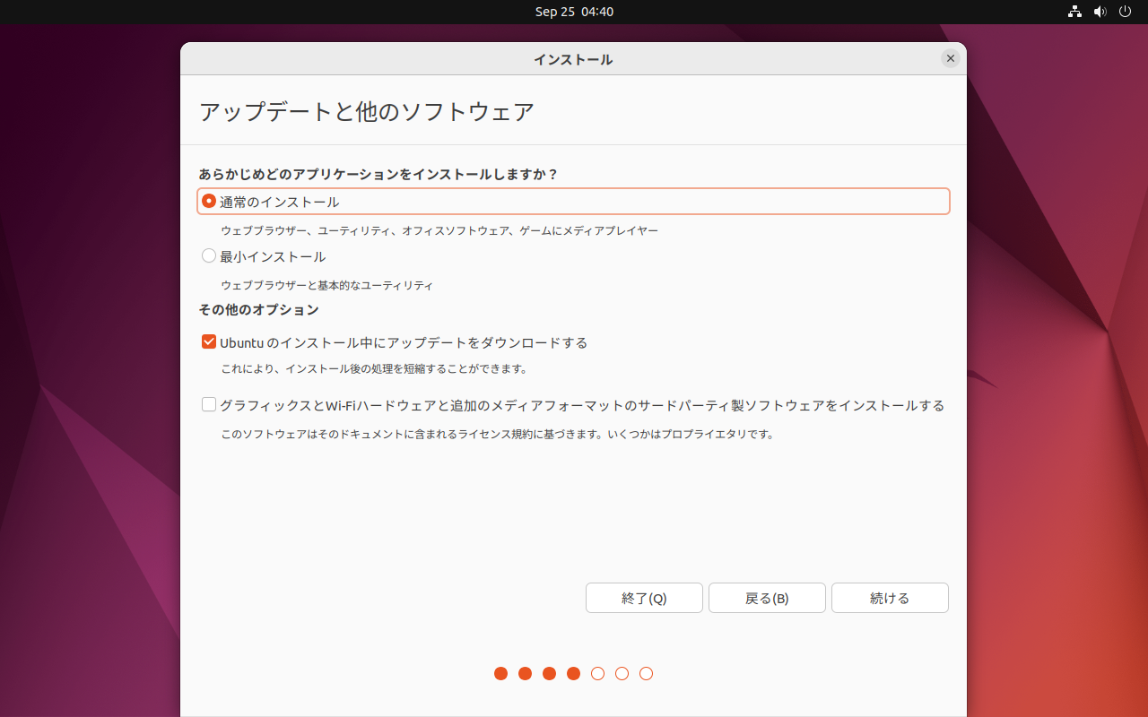 6-5. 以下の画面では、「通常のインストール」「Ubuntu のインストール中にアップデートをダウンロードする」にチェックを入れてください。