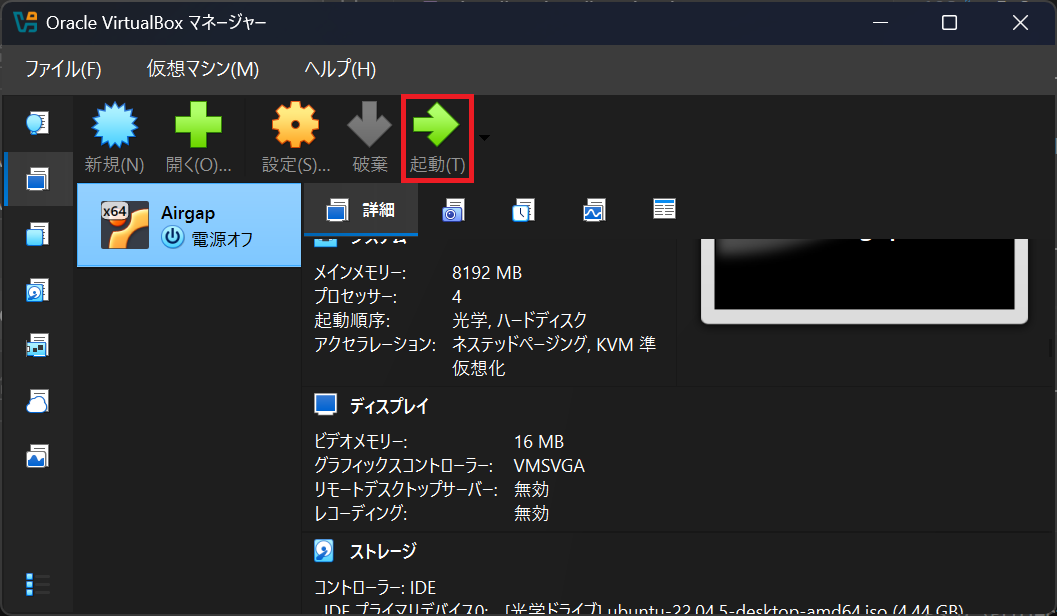 6-1. Oracle VirtualBox マネージャーの「起動」ボタンを押下して仮想マシンを起動します。
