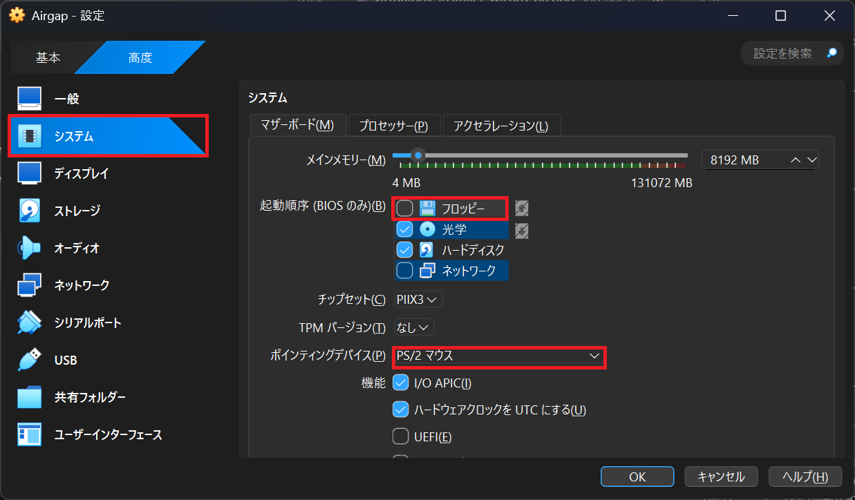 5-3.「システム」メニューを押下し、「フロッピー」のチェックを外し、「ポインティングデバイス」を「PS/2 マウス」に設定します。