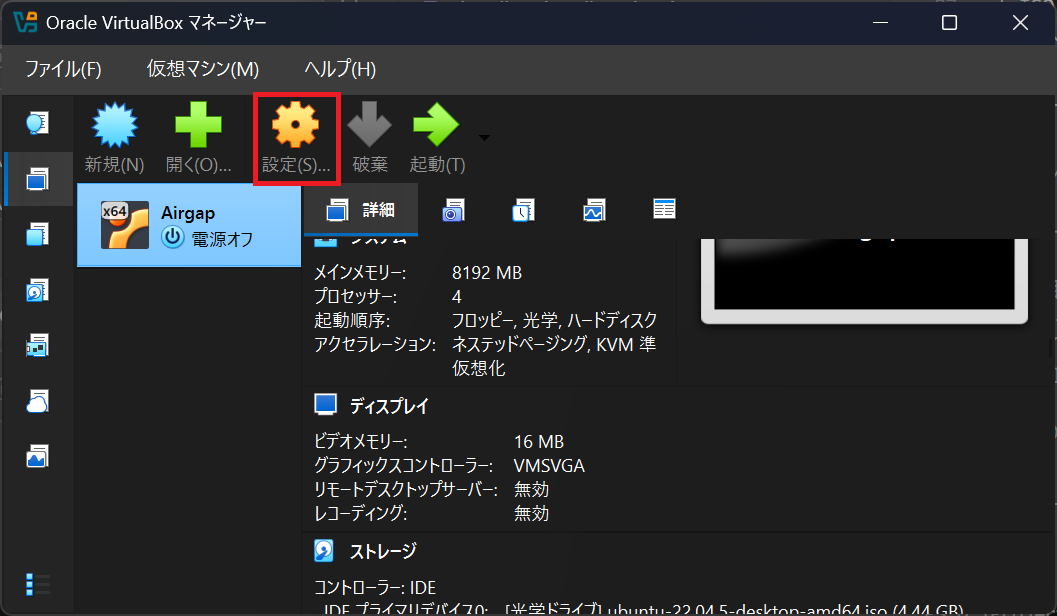 5-1. 作成した仮想マシン(今回は Airgap)を選択し、「設定」を押下します。