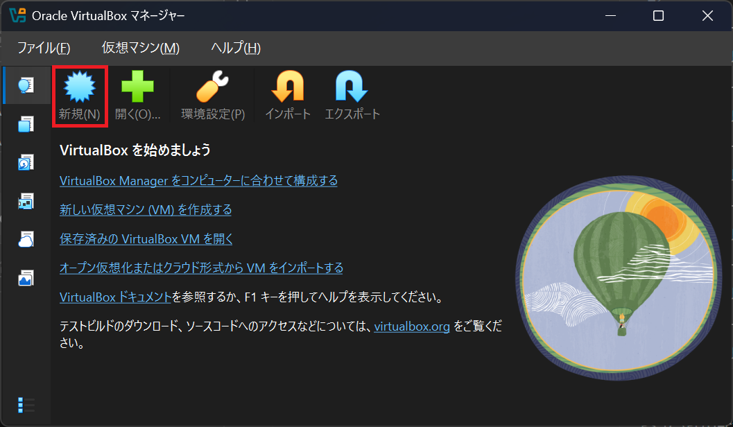 4-1. 以下の画像の赤く囲った「新規(N)」ボタンを押下し、仮想マシンの作成を開始します。